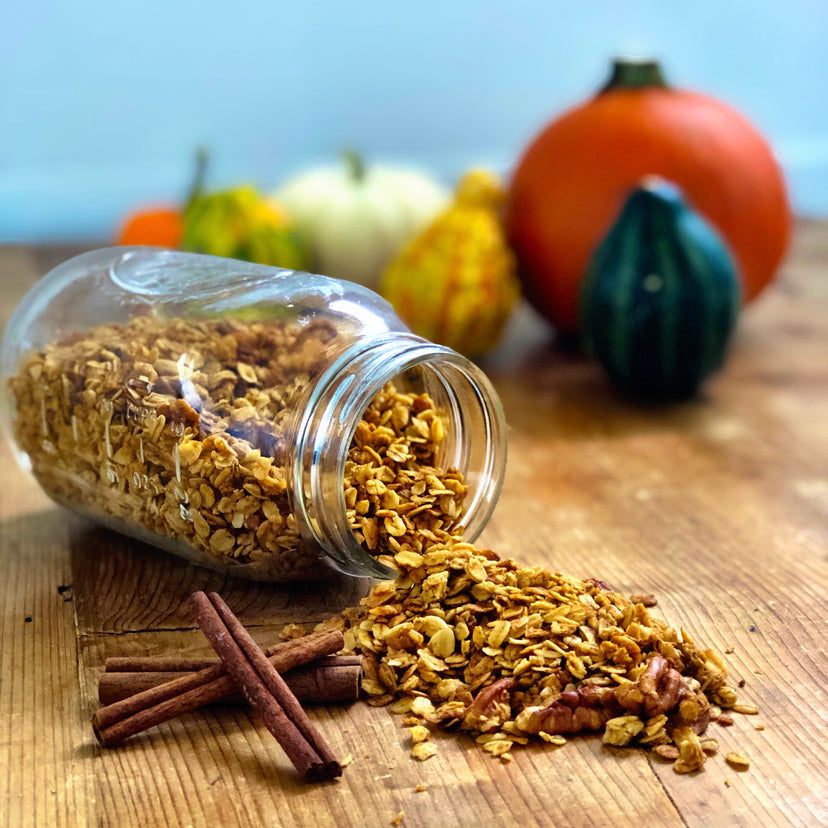 Don't worry, this granola is nothing like the artificially-flavored, sugar-loaded pumpkin spice products you'll find in your grocery store or certain national coffee chains. For this flavor, we started with the same four ingredients we use in all of our granolas: whole grain rolled oats, non-GMO expeller-pressed canola oil, organic honey, and pure maple syrup. To that, we simply added organic pumpkin puree, a blend of spices, and some pecans to create our take on a fall classic!